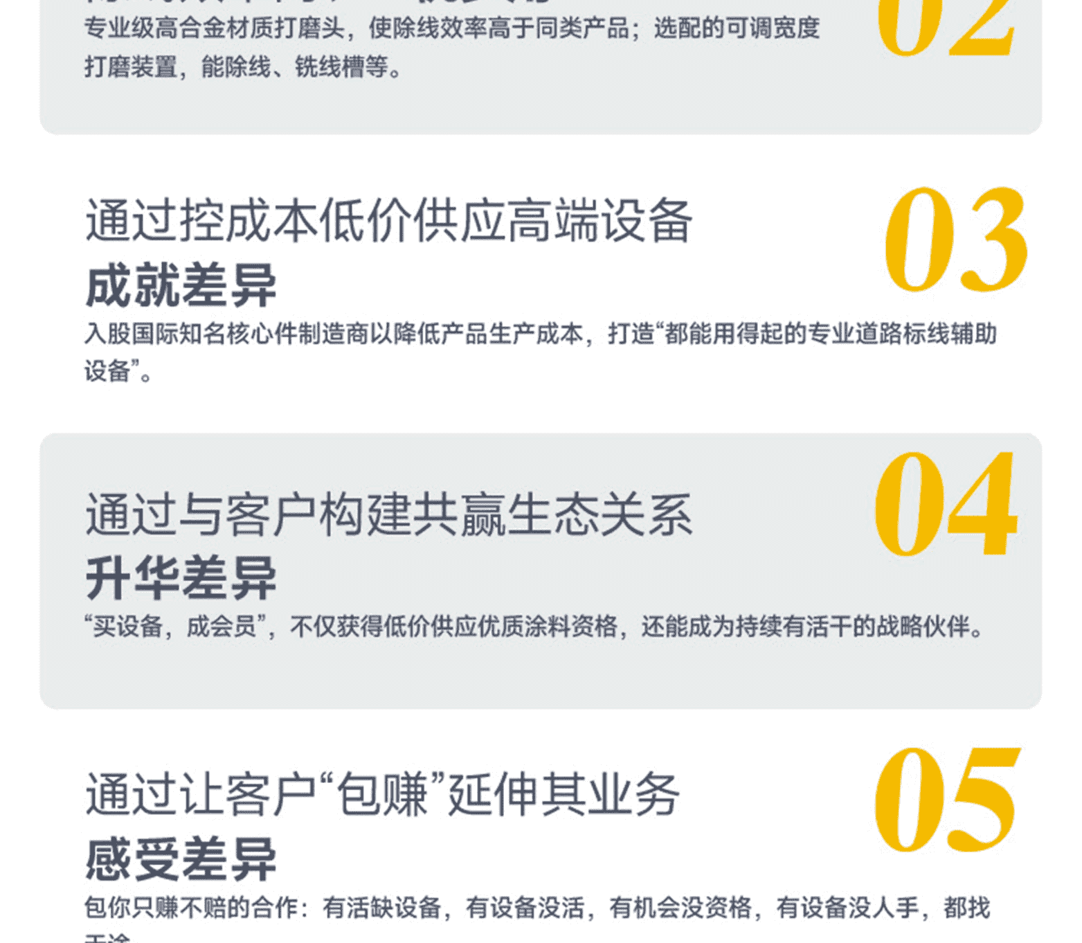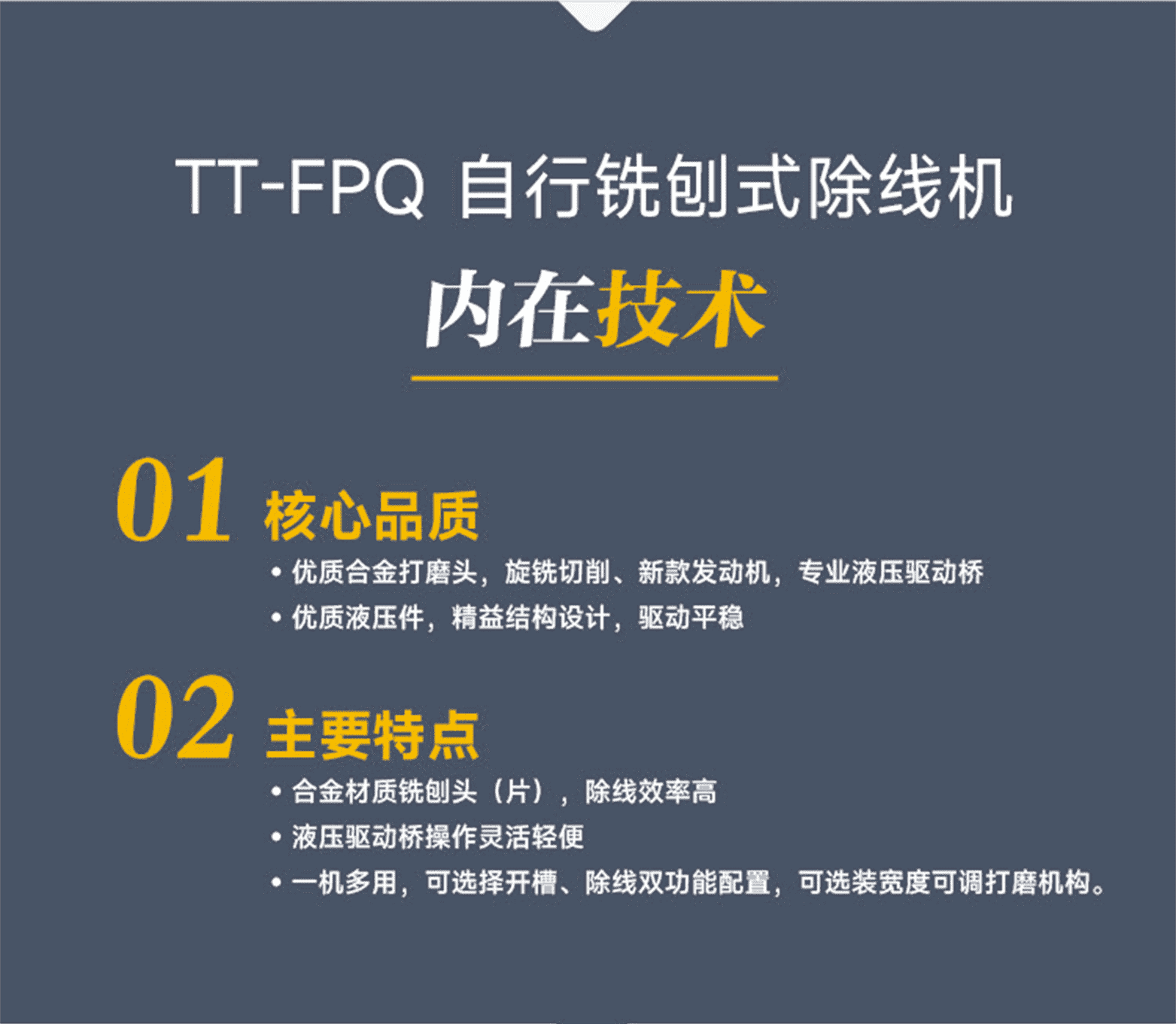 ?專(zhuān)家測(cè)評(píng):核心品質(zhì):優(yōu)質(zhì)合金打磨頭,旋銑切削、新款發(fā)動(dòng)機(jī),專(zhuān)業(yè)液壓驅(qū)動(dòng)橋、優(yōu)質(zhì)液壓件,精益結(jié)構(gòu)設(shè)計(jì),驅(qū)動(dòng)平穩(wěn)。主要特點(diǎn):合金材質(zhì)銑刨頭(片),除線效率高、液壓驅(qū)動(dòng)橋操作靈活輕便、一機(jī)多用,可選擇開(kāi)槽、除線雙功能配置,可選裝寬度可調(diào)打磨機(jī)構(gòu)。