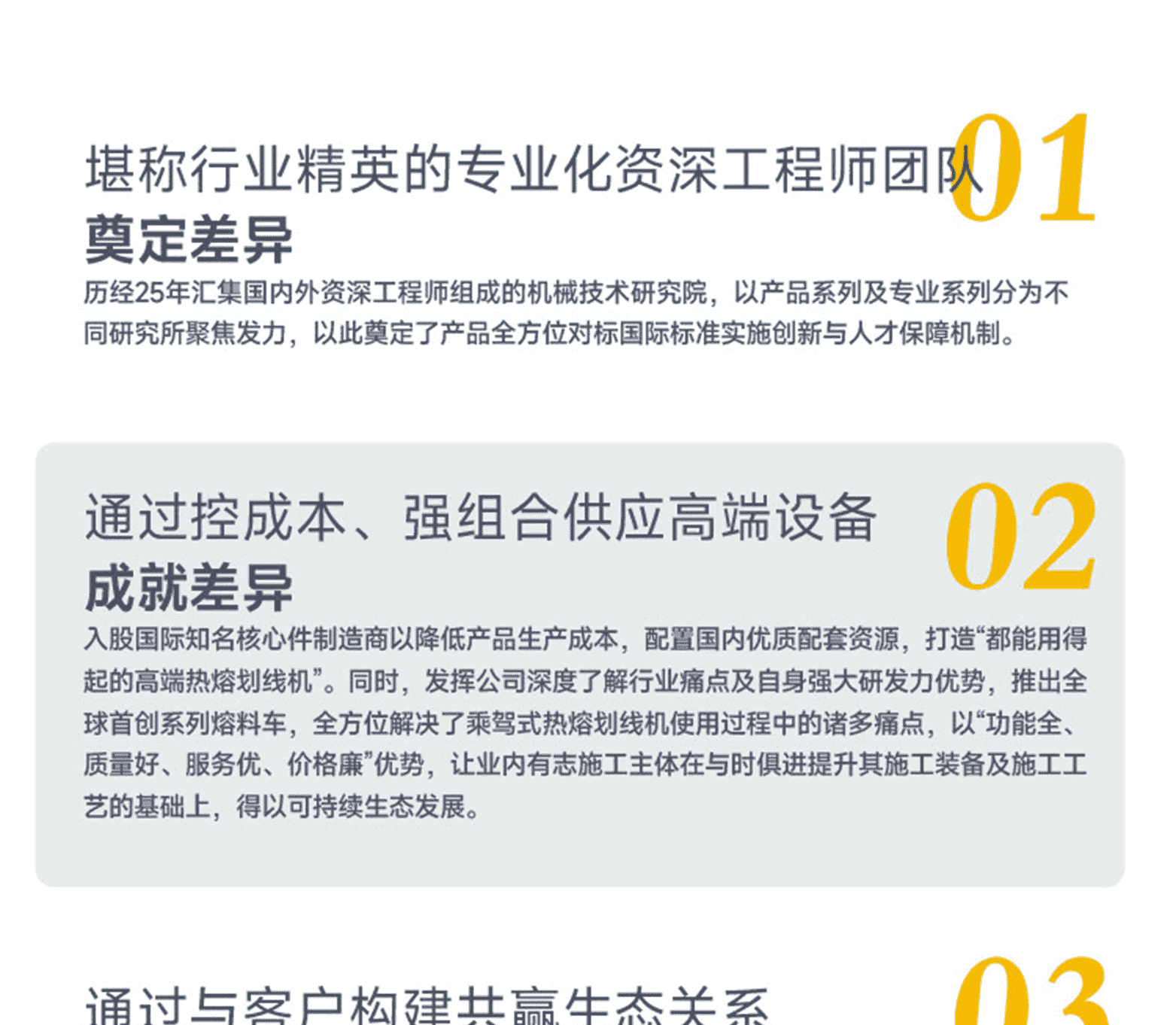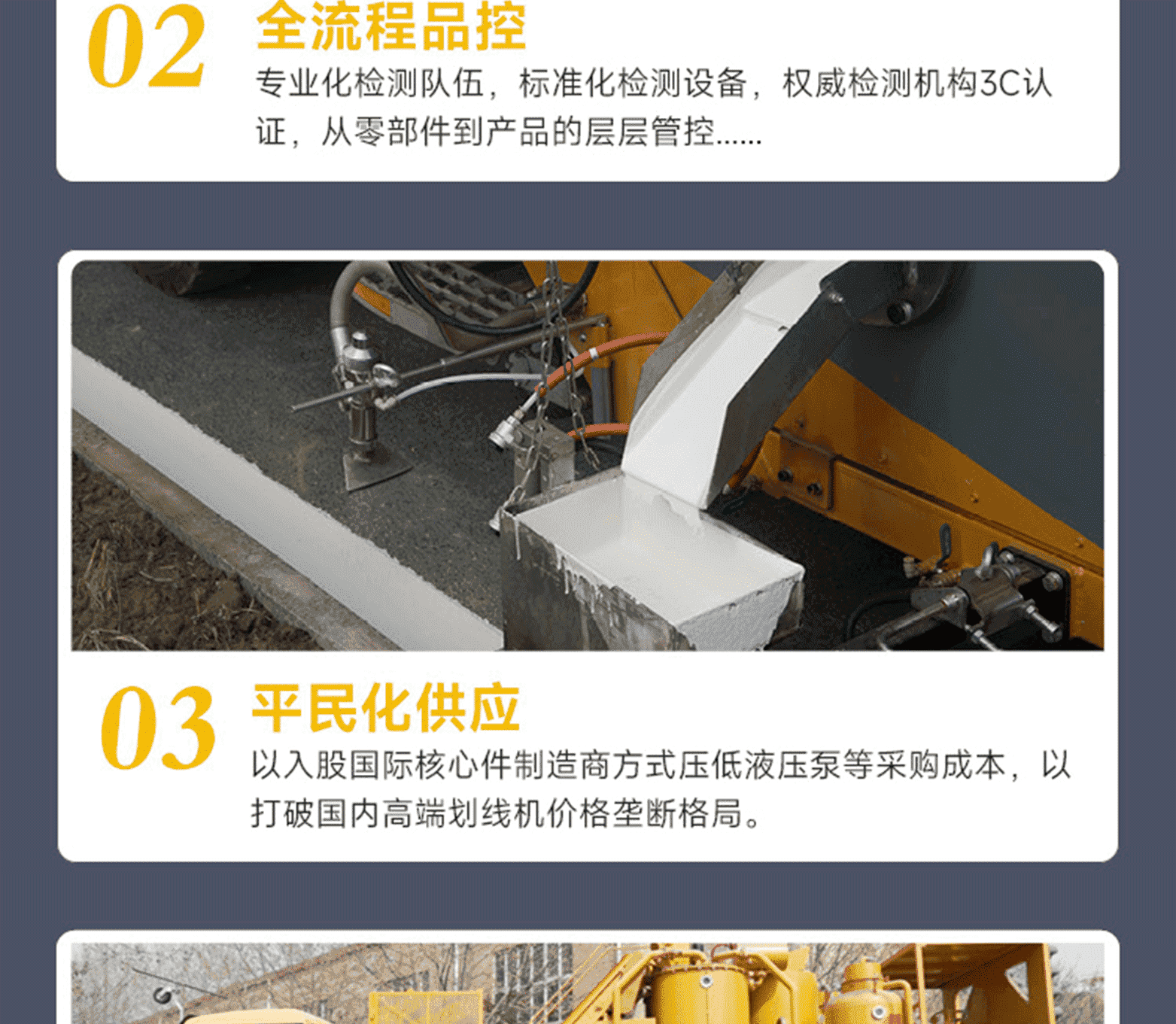 ?專家測評:核心品質(zhì):驅(qū)動系統(tǒng)穩(wěn)定易操作、進口液壓件、易操作式人機對話、熱熔釜導(dǎo)熱油式穩(wěn)定保溫;主要特點:刮敷施劃熱熔平線及震蕩線、擠壓施劃平線、劃線端更換方便、易維護、劃線效率高;
