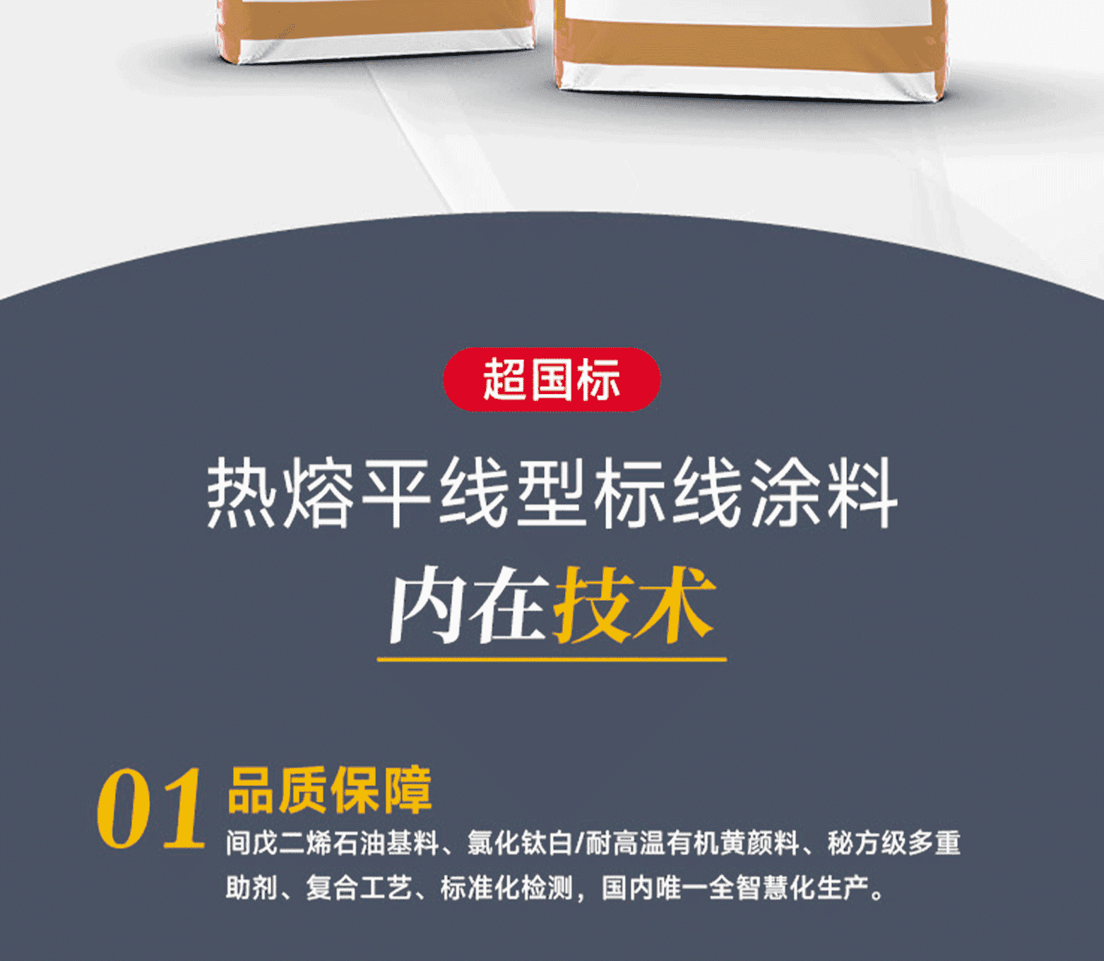 涂料特點:結構密實不開裂,抗壓耐磨不黃變、卓越的識認性、對路面玻璃珠粘接力強。標線特點:表面平滑顏色鮮艷;密實耐磨反光好;不龜裂、不黃變,質量免檢;標線壽命長,是常規熱熔標線的1.6倍。