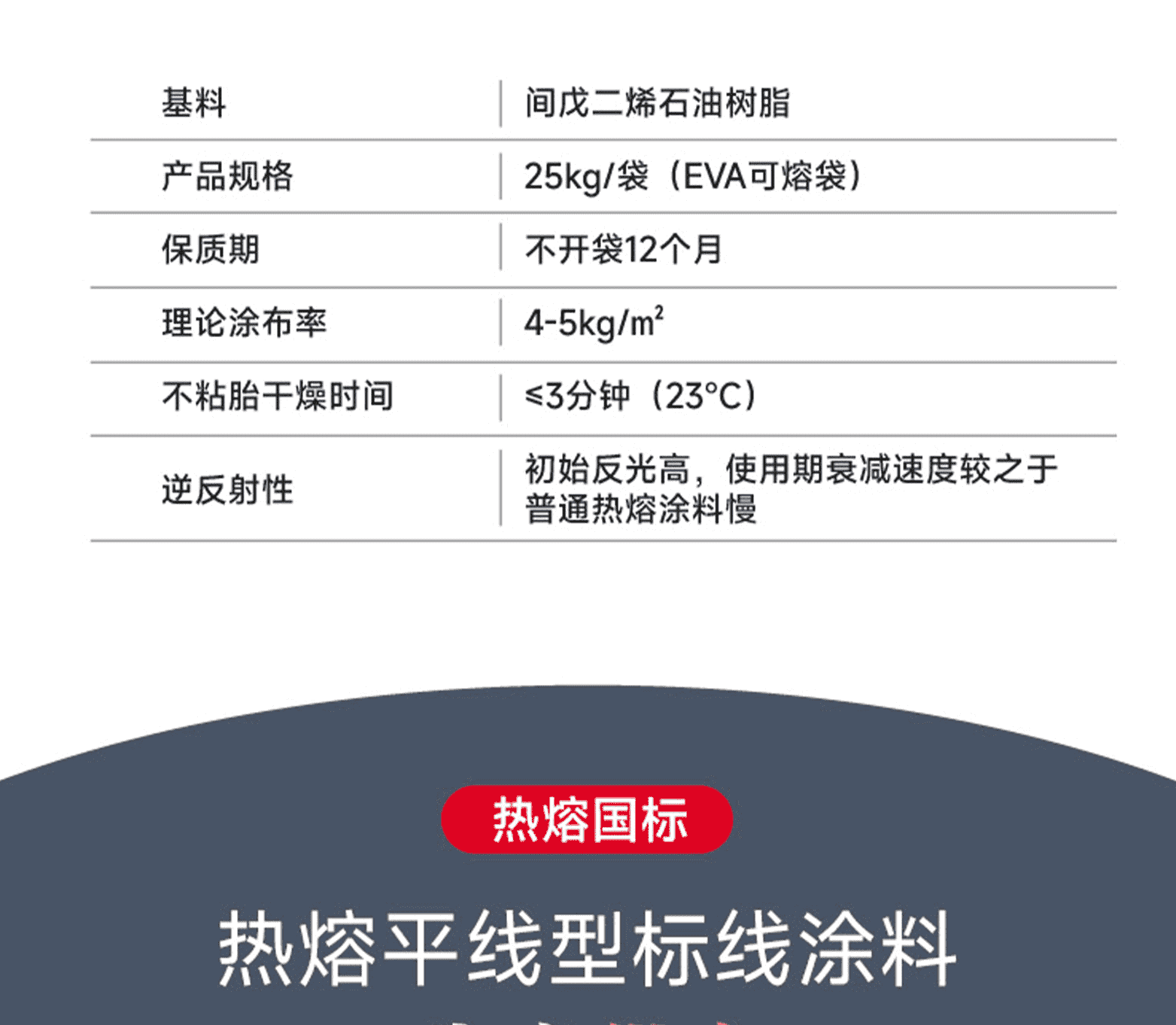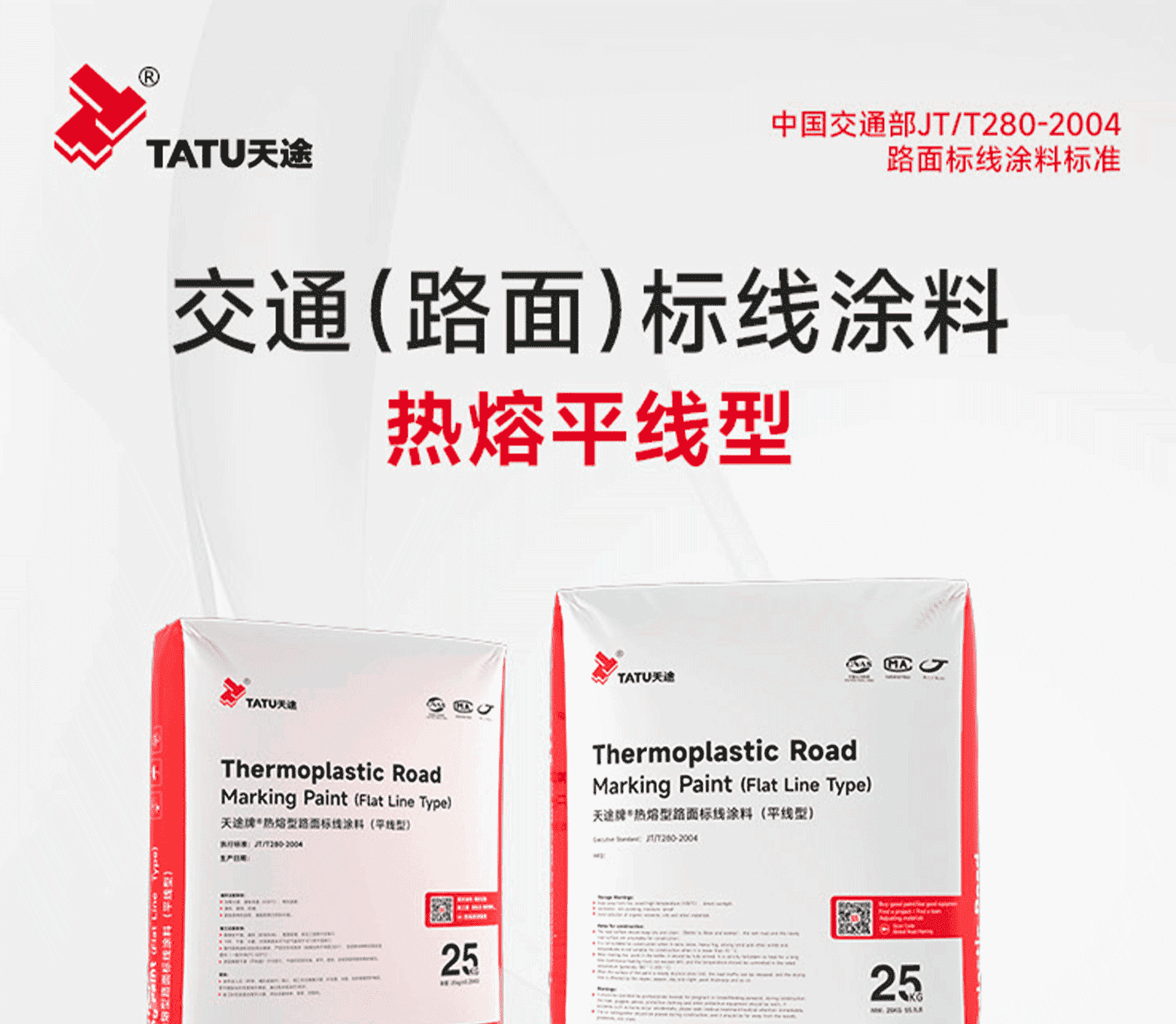 涂料特點:結構密實不開裂,抗壓耐磨不黃變、卓越的識認性、對路面玻璃珠粘接力強。標線特點:表面平滑顏色鮮艷;密實耐磨反光好;不龜裂、不黃變,質量免檢;標線壽命長,是常規熱熔標線的1.6倍。