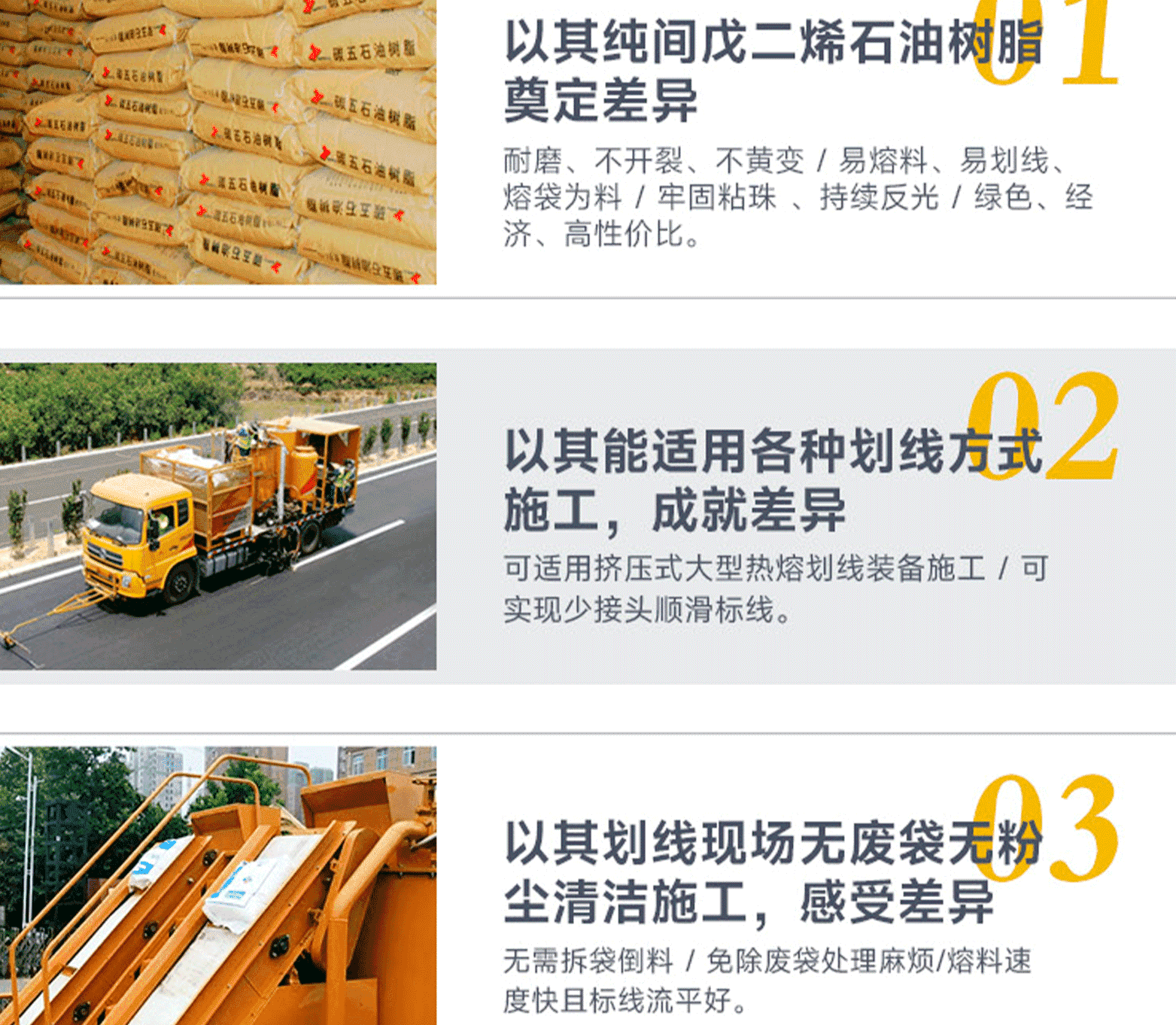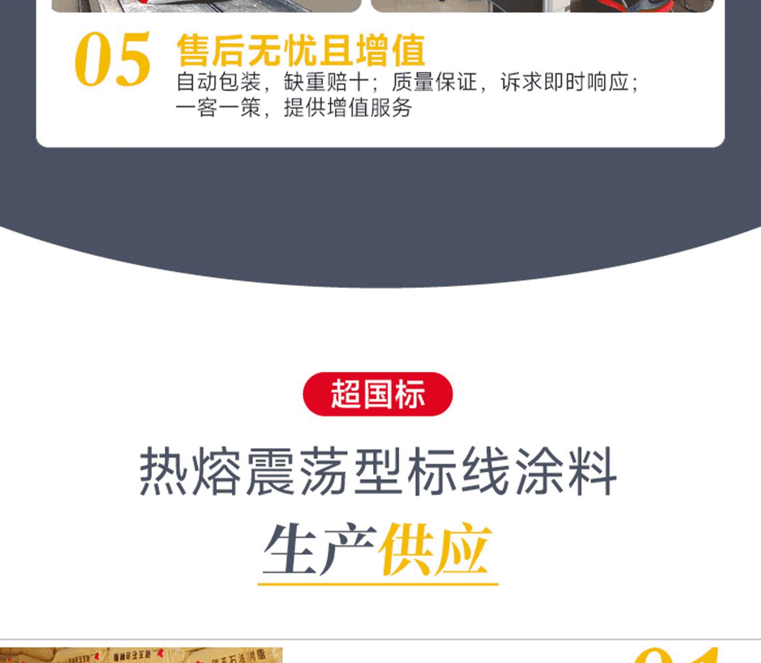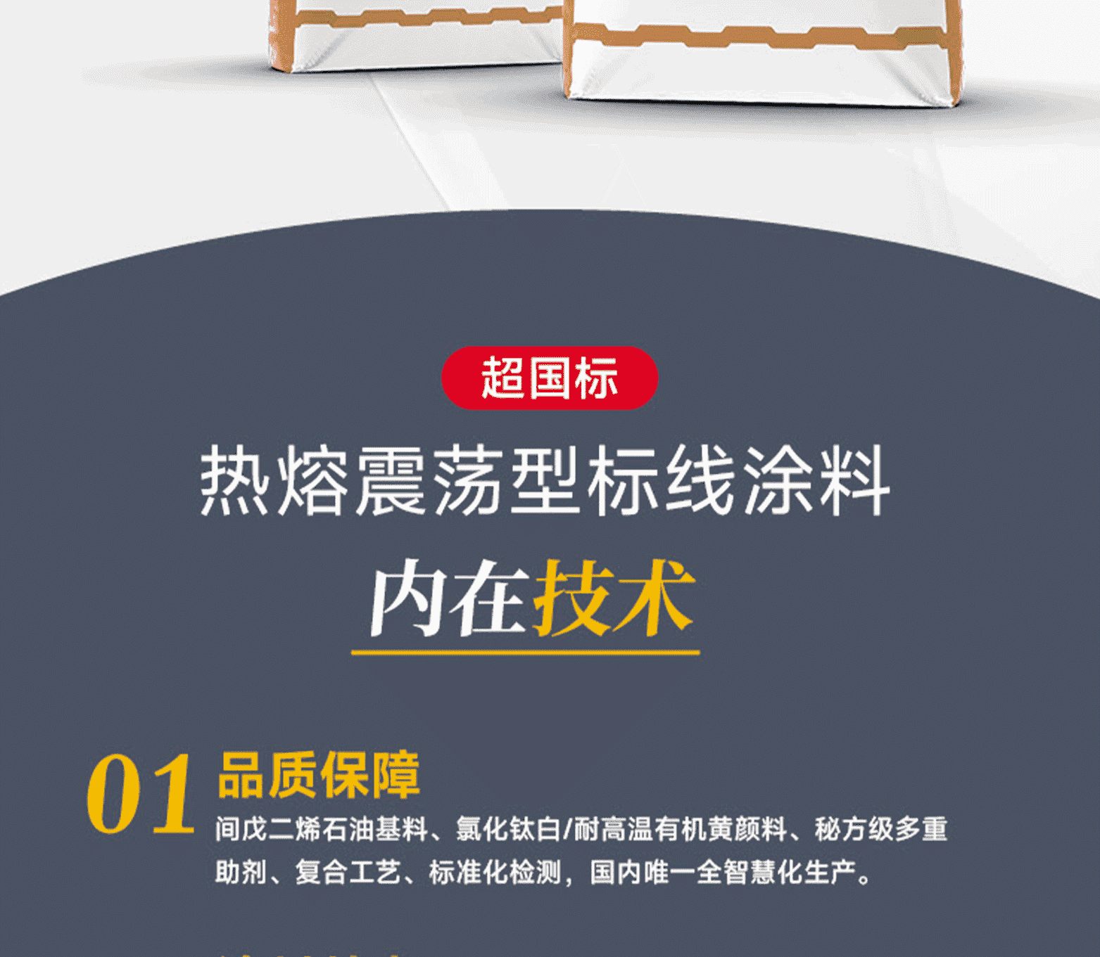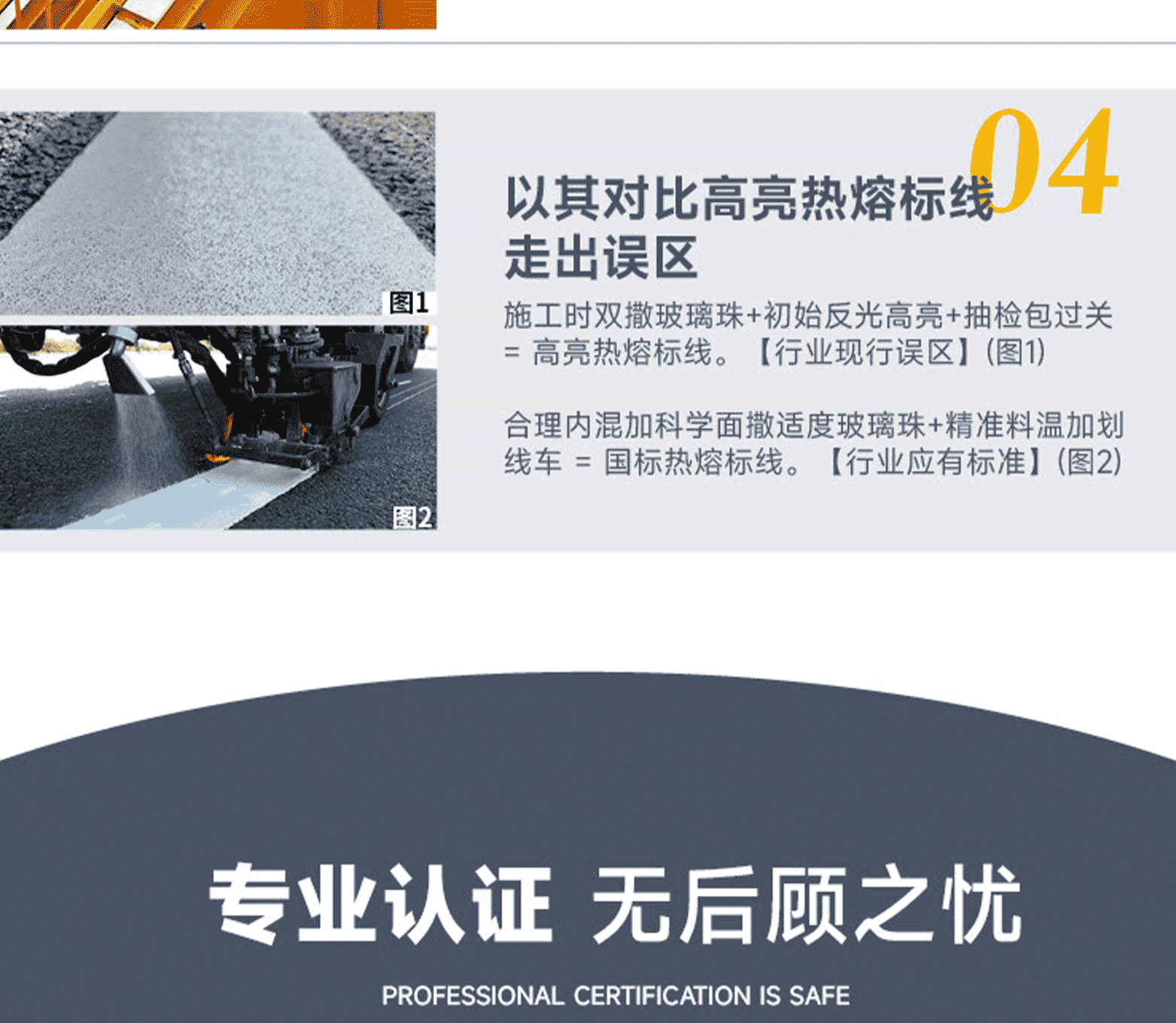 ?專家測評:涂料特點:結(jié)構(gòu)密實不開裂,抗壓耐磨不黃變、卓越的識認性、對路面玻璃珠粘接力強。標(biāo)線特點:表面平滑顏色鮮艷;密實耐磨反光好;不龜裂、不黃變,質(zhì)量免檢;標(biāo)線壽命長,是常規(guī)熱熔標(biāo)線的1.6倍。
