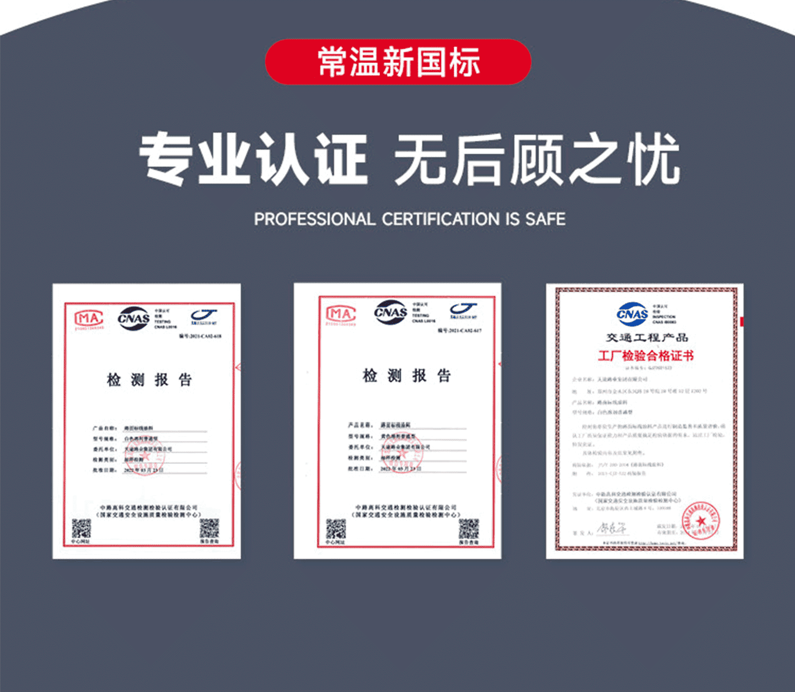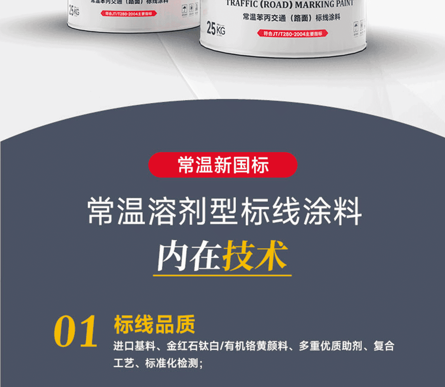標線品質:進口基料、金紅石鈦白/有機鉻黃顏料、多重優質助劑、復合工藝、標準化檢測;標線特點:色澤純正、覆蓋性高、施工性好、耐磨耐黃變、抗沉不起泡、品質一致性高;