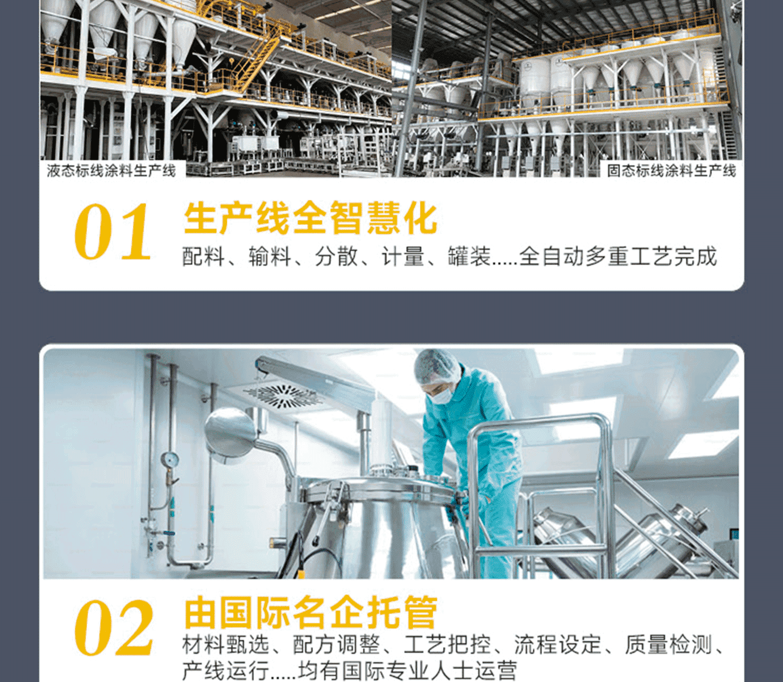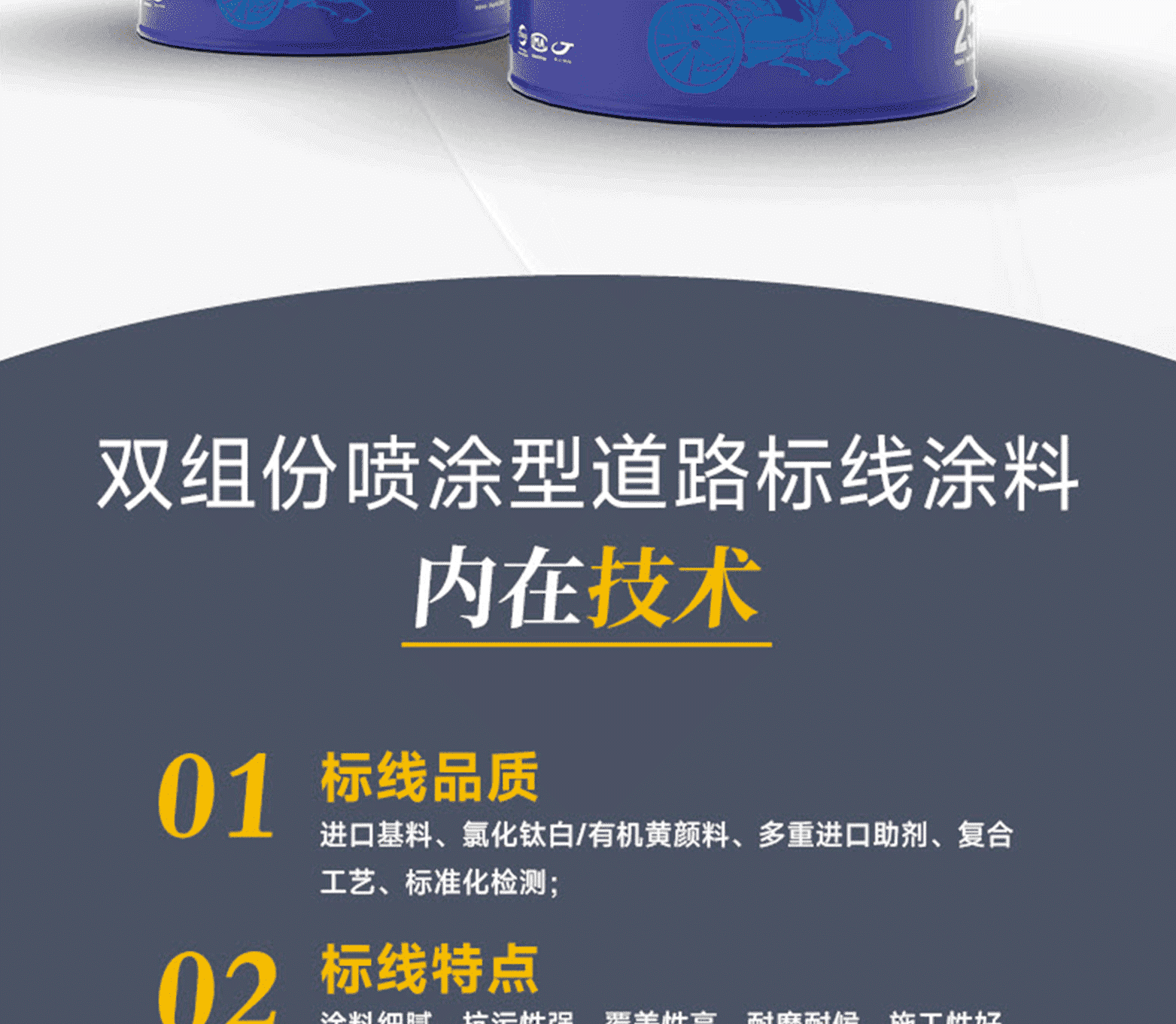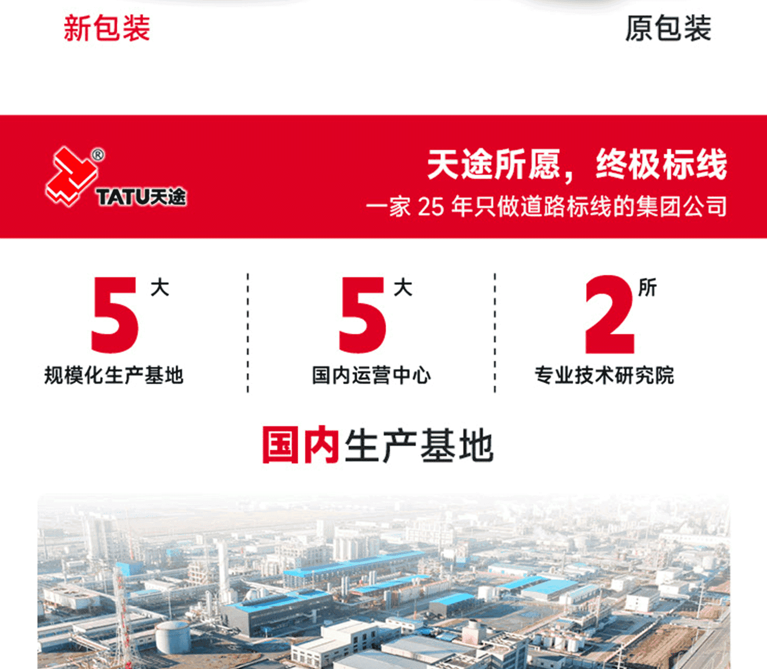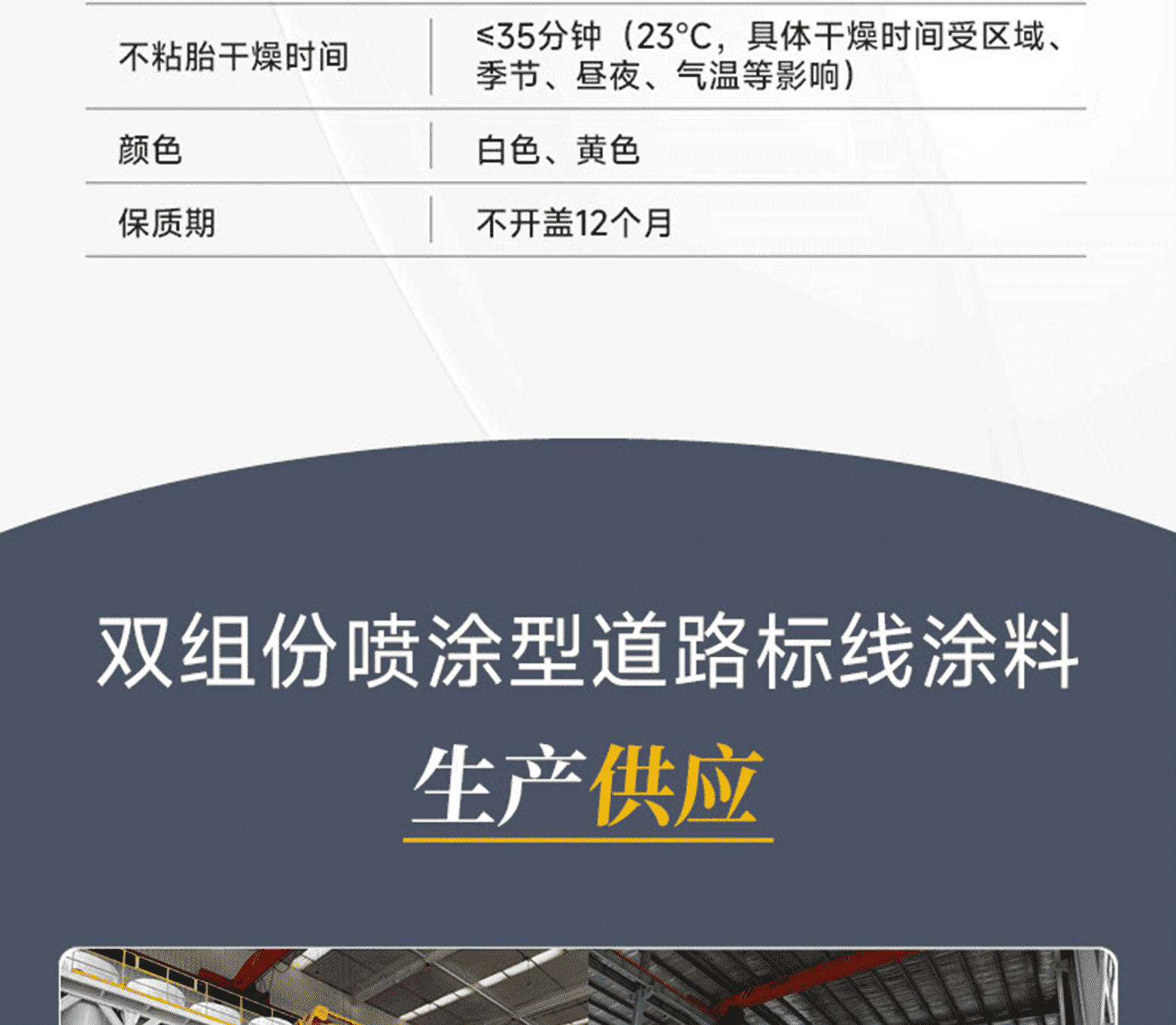 標線品質:進口基料、氯化鈦白/有機黃顏料、多重進口助劑、復合工藝、標準化檢測;標線特點:涂料細膩、抗污性強、覆蓋性高、耐磨耐候、施工性好、抗沉不起泡;